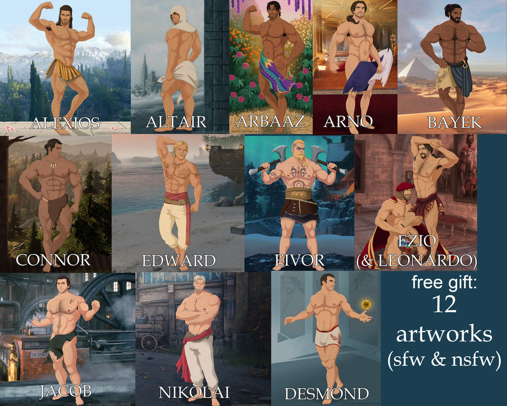 12 uncensored artworks + 2 uncensored group artworks with characters from Assassin's Creed (Alexios, Arno, Altair, Arbaaz, Bayek, Connor, Desmond, Ezio, Edward, Eivor, Jacob, Nikolai)